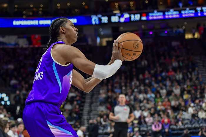 上半场比赛,爵士球员科迪·威廉姆斯出战14分钟,5中3,罚球1中0仅拿6分,正负值-42最低。